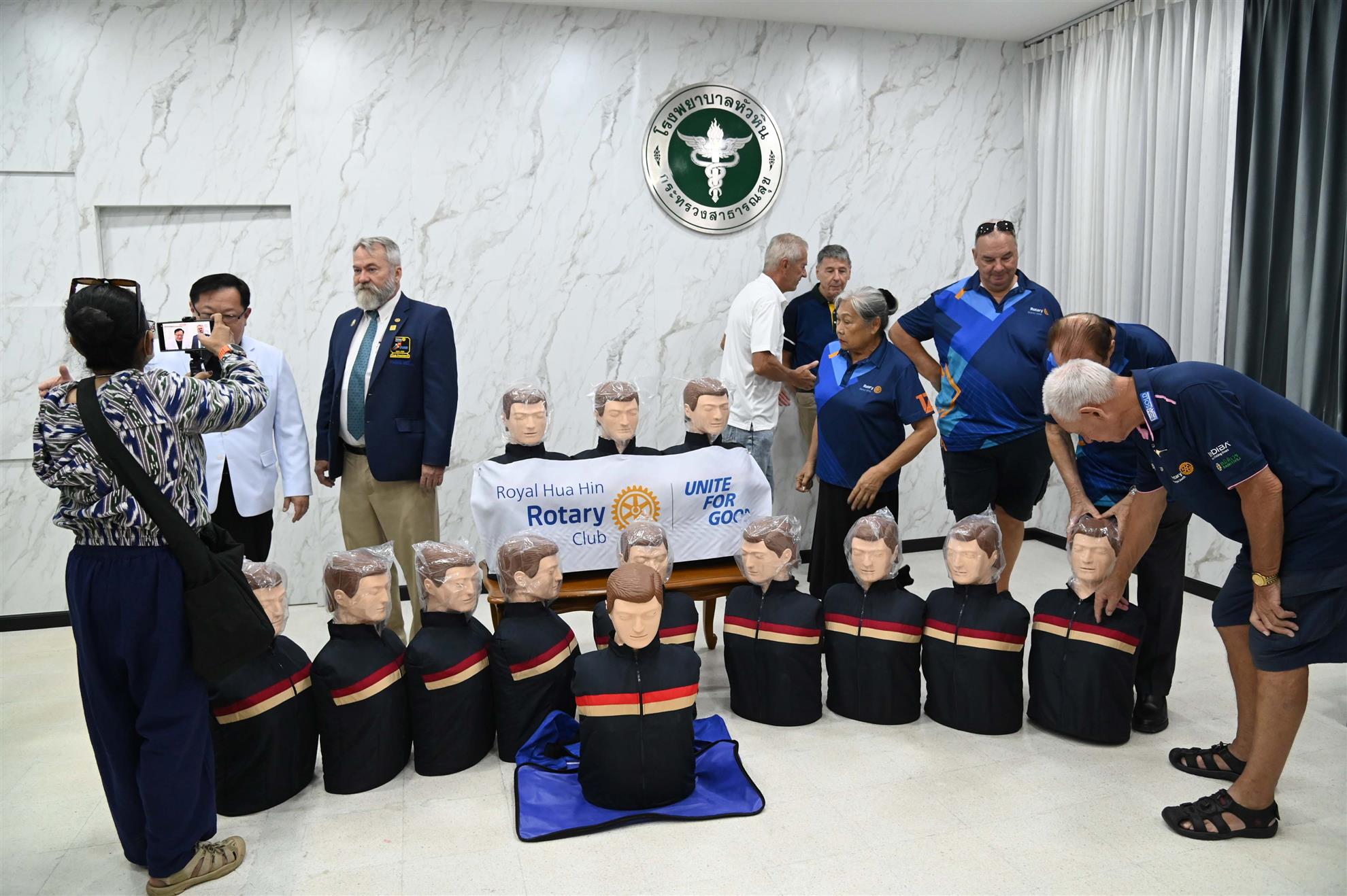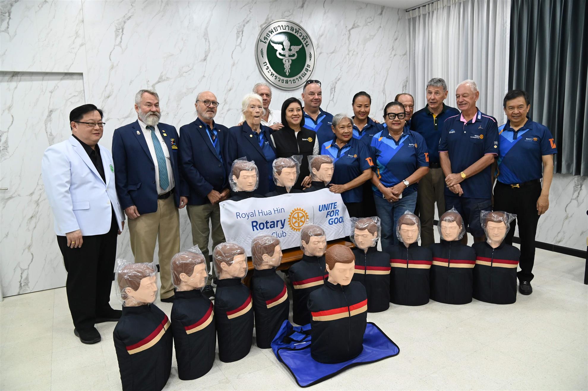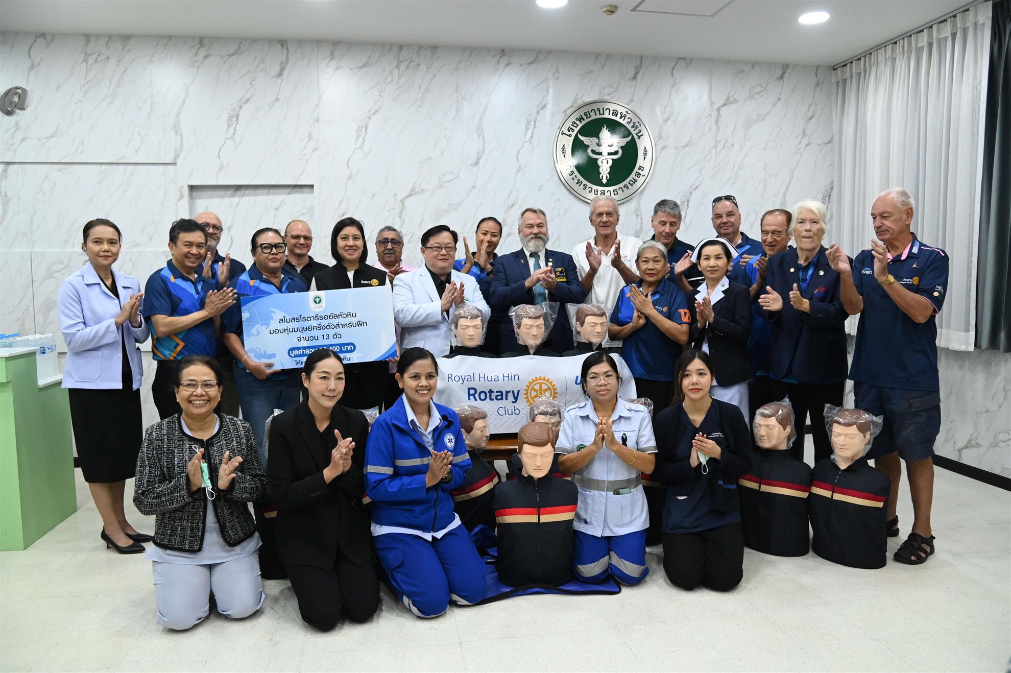 In another joint project with the Rotary Club of Bangkok South, we handed over our donation of 13 new manikins for CPR training to hospital director Dr. Jittarat and the medical professionals at Hua Hin Hospital on 27 November. The hospital formerly had 12 manikins and their CPR trainers often teach in groups of 50 people, so our contribution brings it to 25 manikins in total, enabling two trainees per manikin.