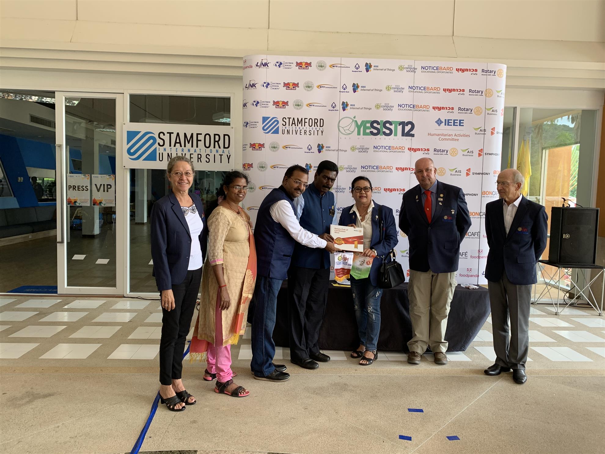 At the opening ceremony of the IEEE, YESIST12 (Youth Endeavors for Social Innovation using Sustainable Technology) at Stamford International University the Rotary Club Royal Hua Hin exchanged club banners with Rotary Club of Coimbatore West and the Rotary Club of Salem Texcity from the state of Salem Tamil Nadu in Southern India.