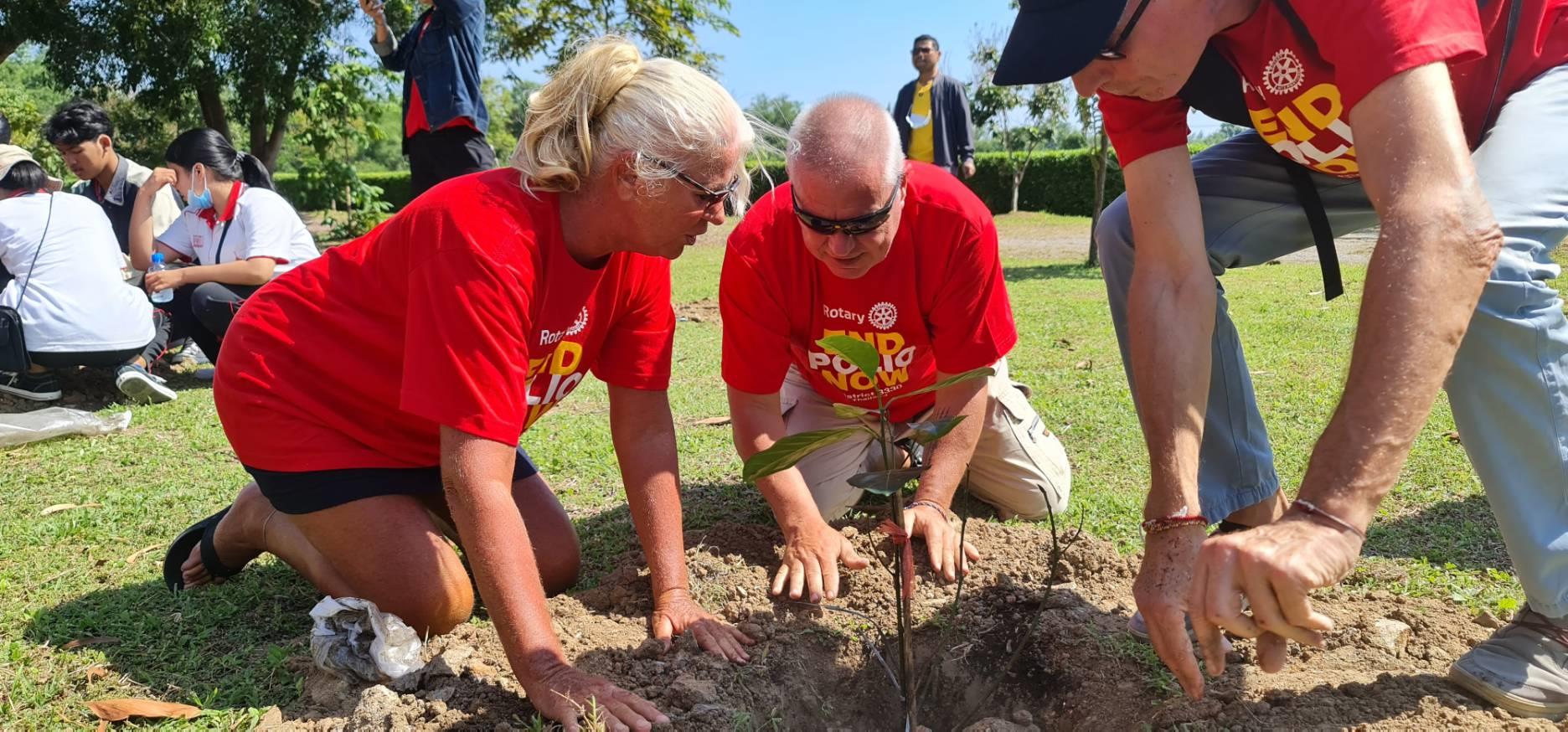 World Polio Day was commemorated in Rotary District 3330 by all clubs in the 30 areas participating in a tree planting day on the 24th October. Rotary International has provided 44.7 million USD in grants to fight polio, with only two countries in the world now having the virus. RC Hua Hin was joined by RC Royal Hua Hin, RC Pranburi and RC Prachuab Khiri Khan, Rotaractor's from the University of Stamford, Webster and Rajamangala also took part. The event was held at the Rajamangala University of Technology in Kao Tao where 100 hundred mango trees were planted. Area 16 were pleased to welcome District Governor Chalermchat Chun -In and his wife Nitaya at the event.